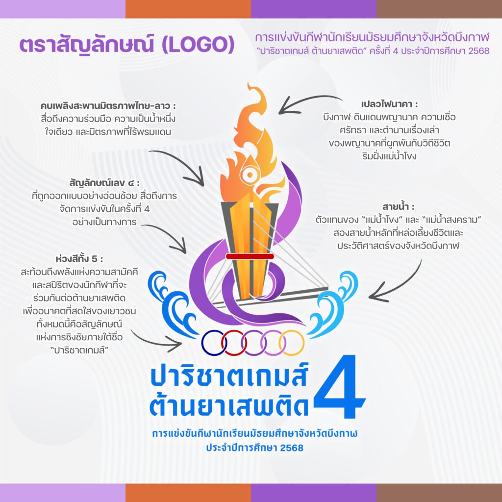 ตราสัญลักษณ์การแข่งขันกีฬานักเรียนมัธยมศึกษาจังหวัดบึงกาฬ “ปาริชาตเกมส์” ครั้งที่ 4 โดยโรงเรียนเซกาเป็นเจ้าภาพ ใช้แนวคิดการออกแบบและแรงบันดาลใจจากอัตลักษณ์ และแหล่งท่องเที่ยวสำคัญของจังหวัดบึงกาฬ